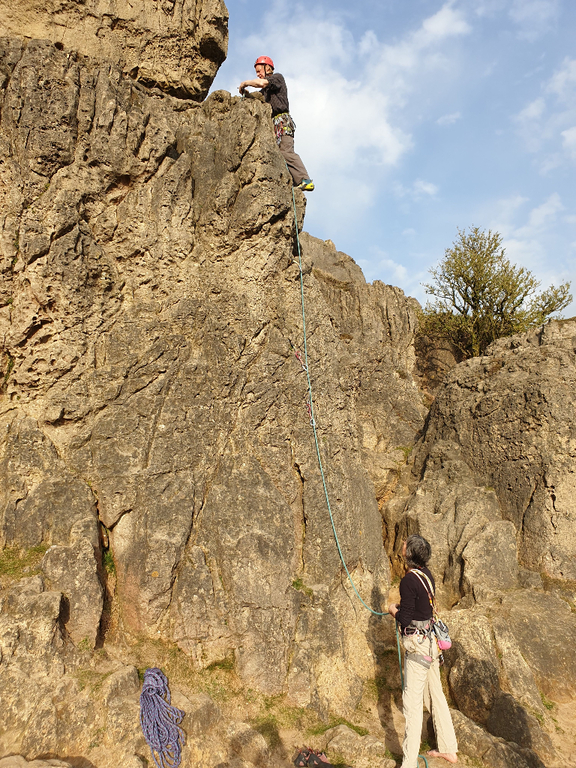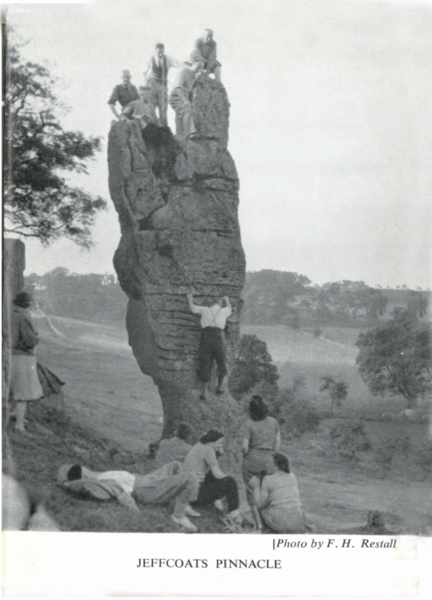 The Peak Limestone South guide has this wonderful old sepia photo (from 1942!) of climbers on this local limestone pinnacle (“Jeffcoats Pinnacle”). The photo shows the brave male climbers at the top with the women looking up in admiration from below (actually mostly just chatting away ignoring the show offs!).